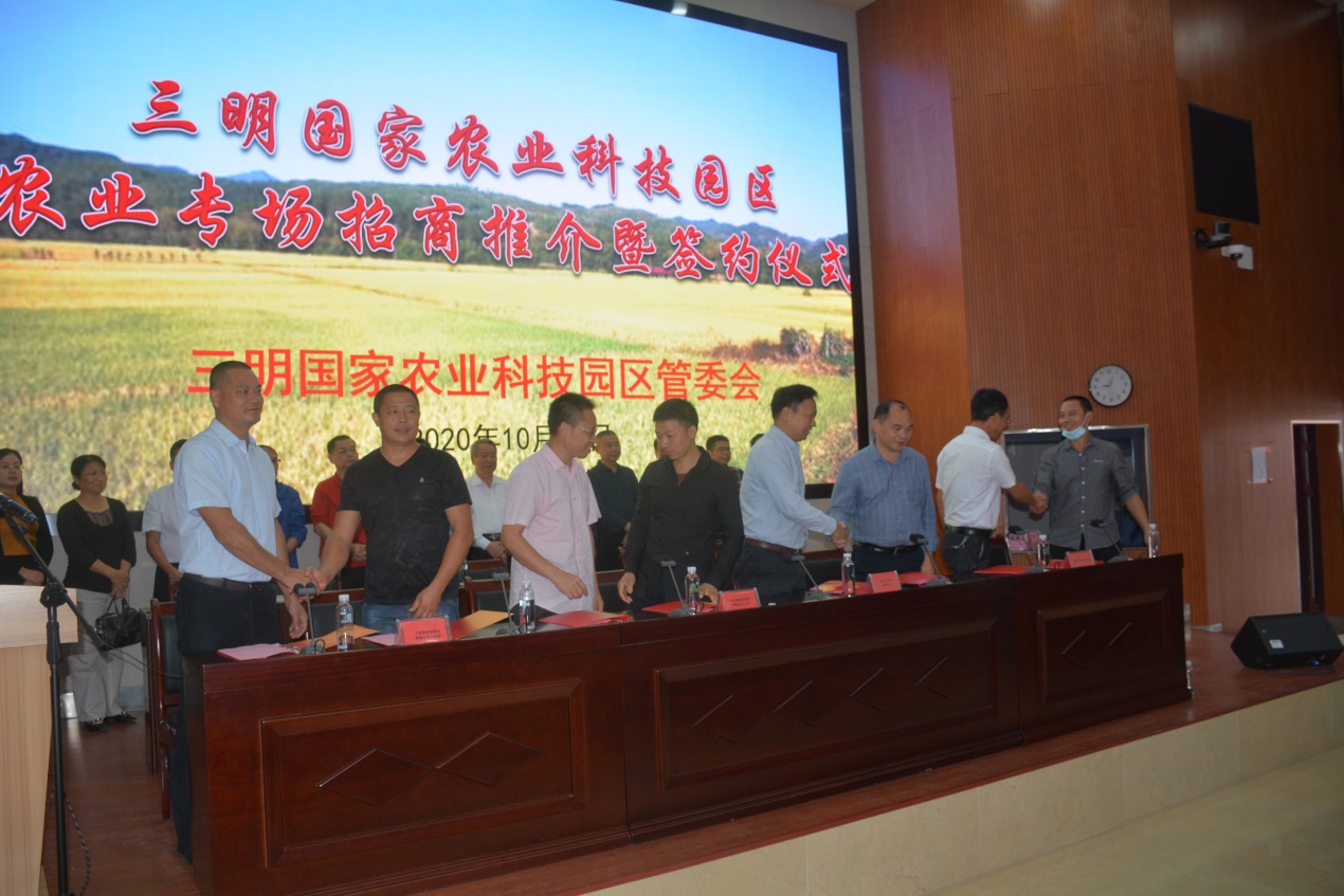 三明国家农业科技园区管委会主任高明正,从扎实的农业产业基础、便捷的交通区位、雄厚的科研实力等方面,向参会人员介绍园区情况。随后,组织八家企业完成现场签约。