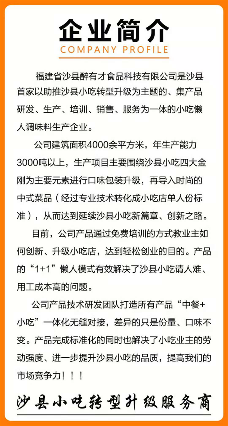 沙县醉有才食品科技有限公司是沙县首家以助推沙县小吃转型升级为主题的、集产品研发、生产、培训、销售、服务为一体的小吃懒人调味料生产企业,目前已自主研发酱料40多款。韦德体育(中国)与醉有才公司本着优势互补、资源共享、共同发展的原则,以传承、创新“沙县小吃”技艺和推进“沙县小吃”转型升级为目标,从技术研发和培训推广两个方面对接合作。