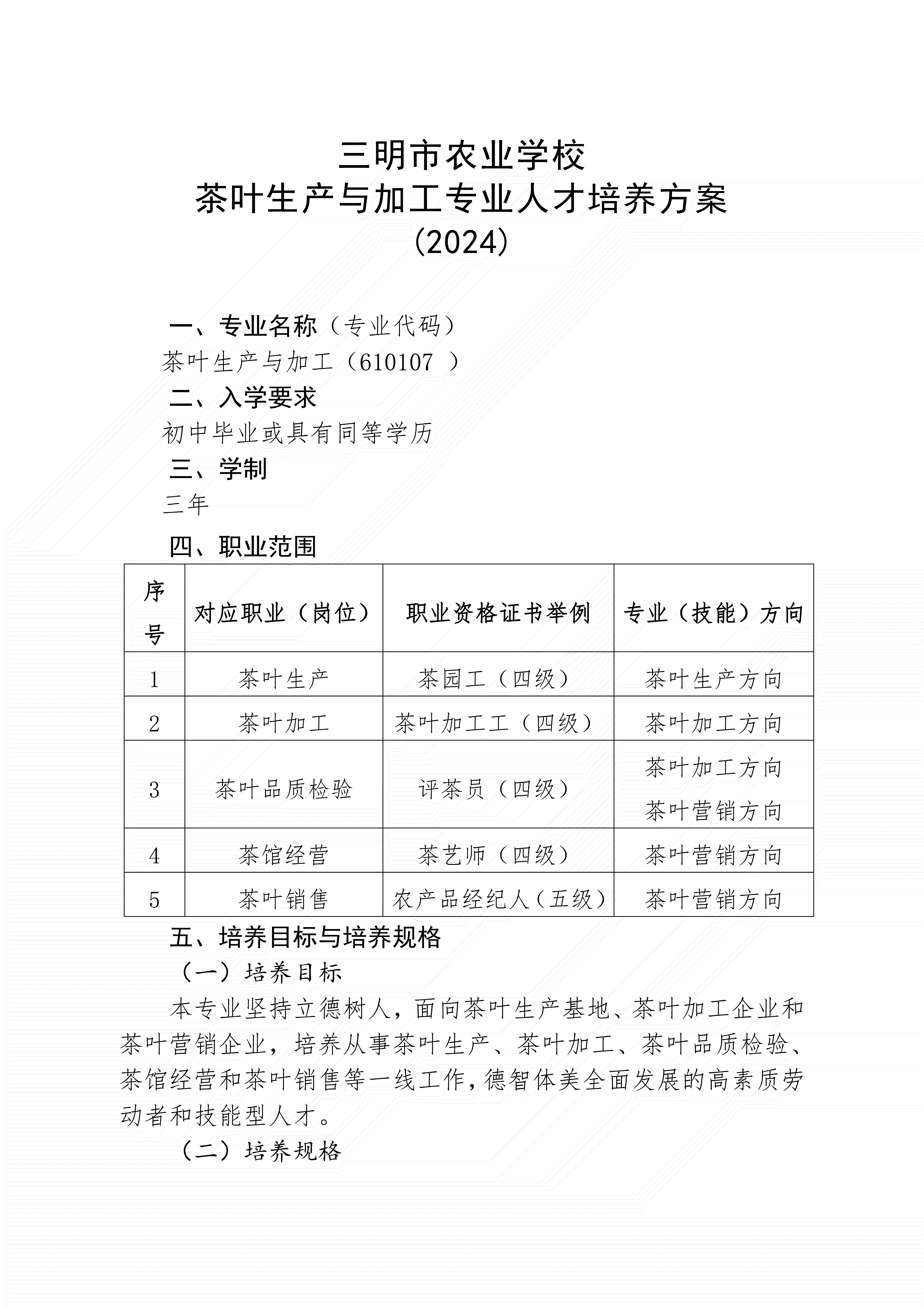 三明市农业学校茶叶生产与加工专业人才培养方案(2024)